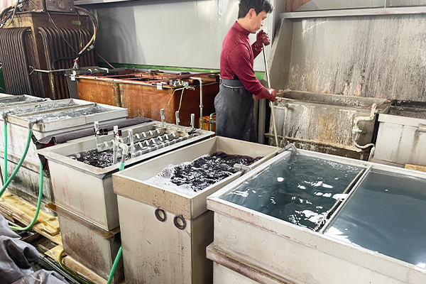 素材に応じて薬品を選定させていただき、温度や濃度・時間などを計算して加工をいたします。